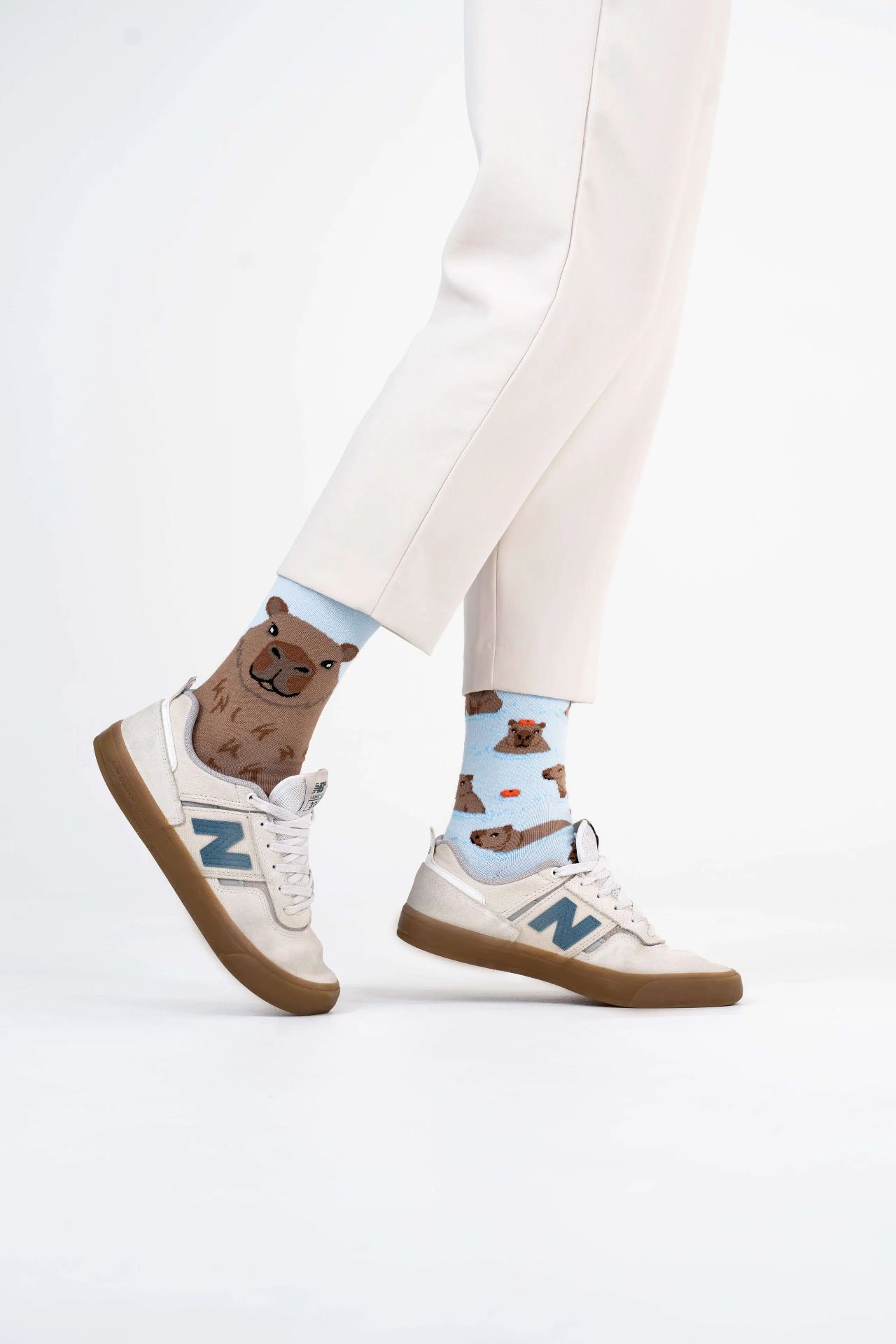 Το πρωί είναι η ώρα του κοπαδιού να ξεκουραστεί στο συρτάρι, αλλά τις πιο ζεστές στιγμές της ημέρας, οι κάλτσες θέλουν να βουτήξουν στη λάσπη του διαδικτύου. Η αριστερή κάλτσα ήρθε από τη Νότια Αμερική και η δεξιά – κατευθείαν από την κουλτούρα των μιμιδίων. Αυτή είναι η κάλτσα capybara – το μεγαλύτερο τρωκτικό ανάμεσα στις κάλτσες!
