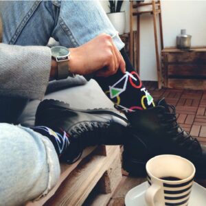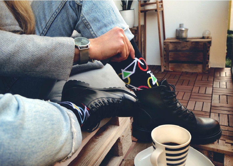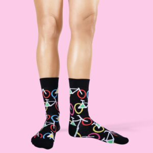 Σου αρέσει να κάνεις ποδήλατο; Για όλους όσους προτιμούν το ποδήλατο από το παλιό βρωμερό καροτσάκι. Το μοντέλο μας με τις κάλτσες UnaBux CYCLE κόβει μια λεπτή σιλουέτα κάτω από τις σφιχτές γάμπες των ποδηλατών και επίσης στα παπούτσια κλικ του ποδηλάτου σας. Πολύχρωμοι τροχοί σε μαύρο φόντο ασφάλτου. Ισχυρός! Λοιπόν: κάλτσες πάνω, κράνος πάνω και έξω στο ποδήλατο!