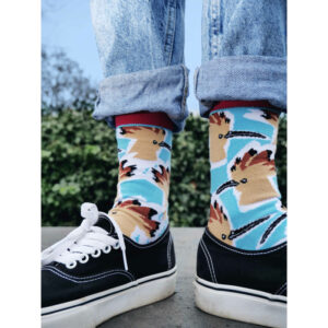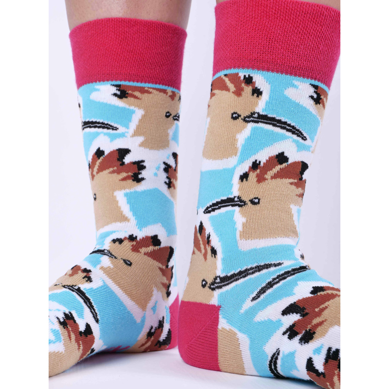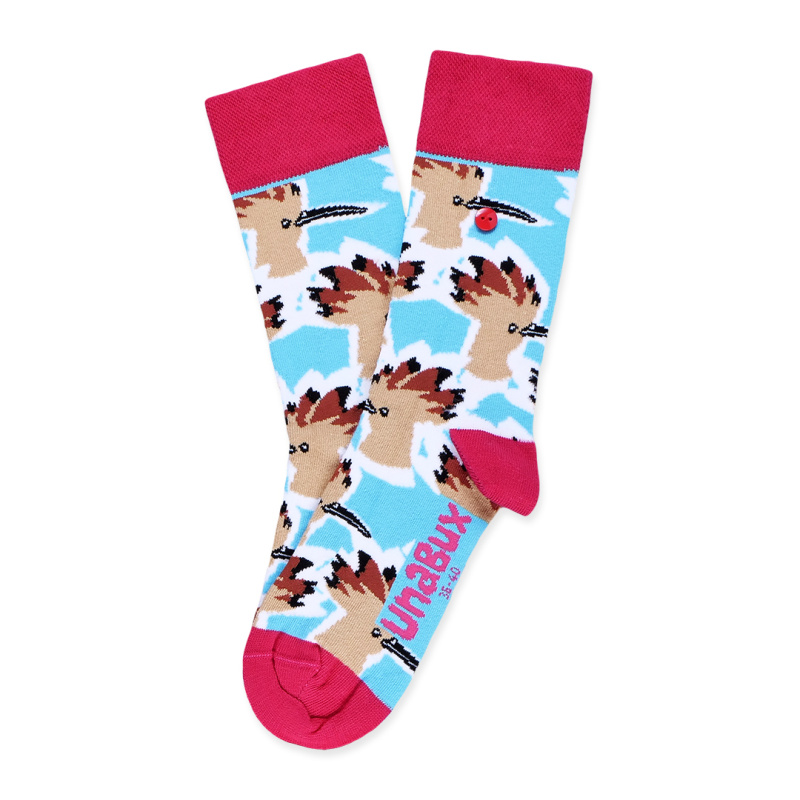 Στο μοντέλο κάλτσας UnaBux HOOPOE, υπάρχουν μερικές τσαλακωμένες κεφαλές τσαλακωτού που φέρουν κομψό ράμφος σε γαλάζιο φόντο ανάμεσα σε κόκκινα δάχτυλα και μανσέτες. Άγριο πουλί άγριο!