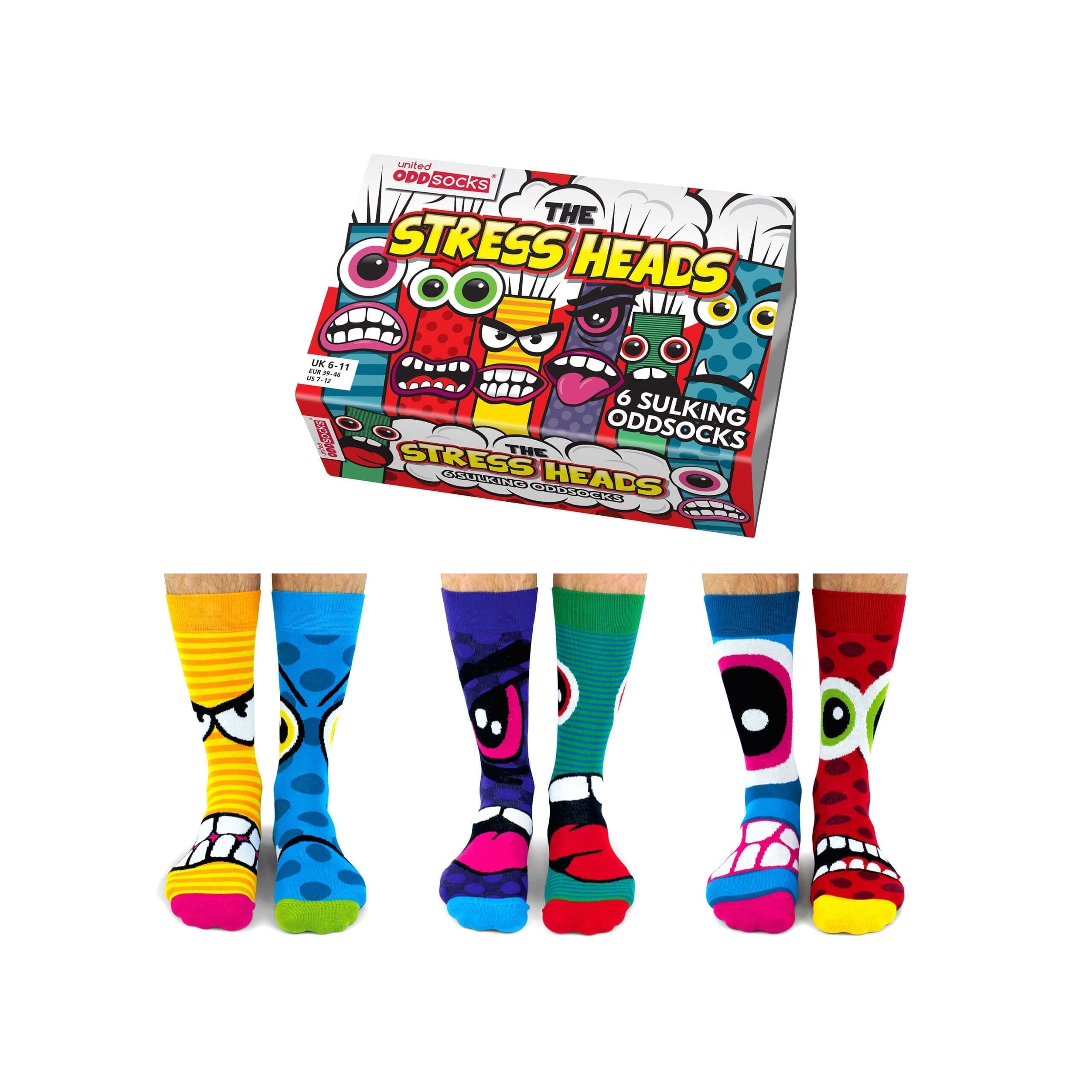 Ηρέμησε! Μην αφήνετε το άγχος να σας επηρεάσει! Με τη γκάμα των Oddsocks που έχει δοκιμαστεί με άγχος, μπορείτε να διοχετεύσετε όλη την ένταση στα πόδια σας όπου θα καταβροχθιστεί ακίνδυνα. Αυτά τα έξι πεινασμένα Stress Head τρέφονται από την απογοήτευση, ώστε να μπορείτε να παραμείνετε μια εικόνα ηρεμίας και γαλήνης από τους αστραγάλους και πάνω. Και με έξι κάλτσες να αναμειγνύονται και να μην ταιριάζουν, δεν υπάρχει τίποτα που μπορεί να σας ρίξει η μέρα σας που αυτές οι άγριες ορέξεις δεν μπορούν να αντέξουν.